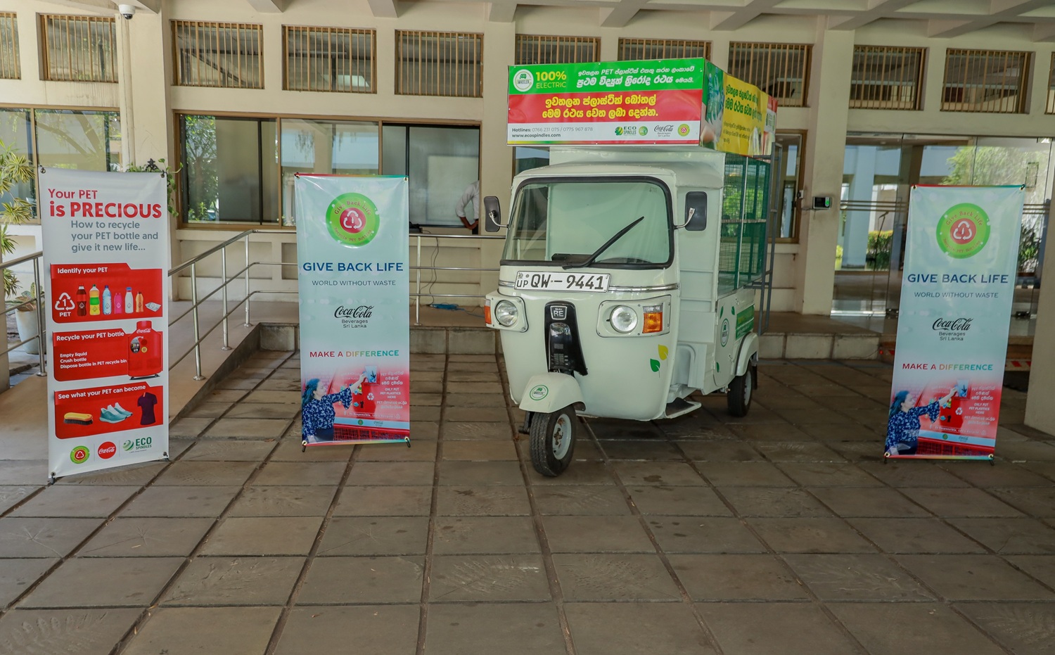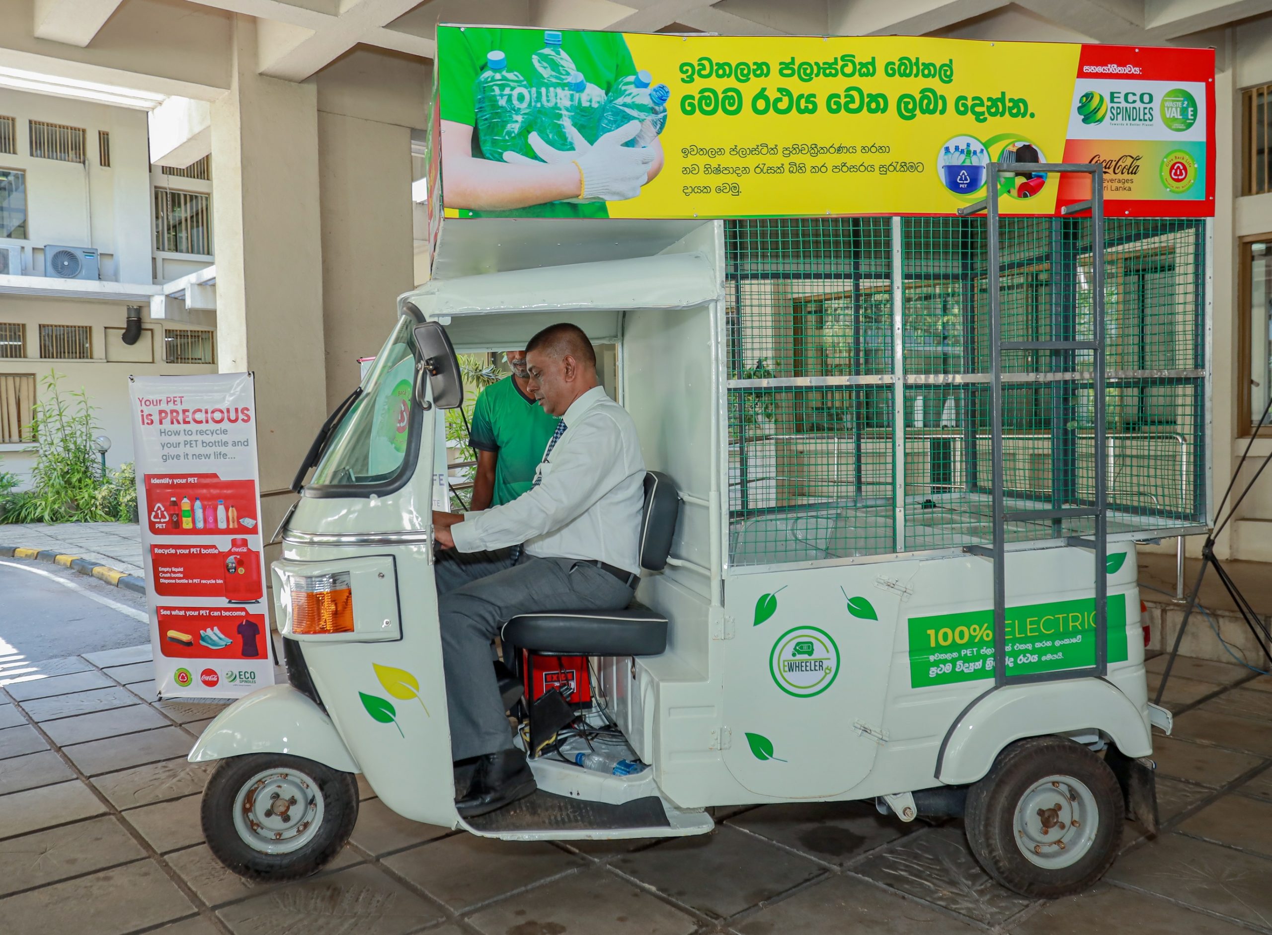 இந்த முயற்சி Eco Spindles பிரைவேட் லிமிடெட் நிறுவனத்தின் ஆதரவுடன் மேற்கொள்ளப்பட்டது. பிளாஸ்டிக் கழிவு சேகரிப்பில் புரட்சிகரமான மாற்றத்தை ஏற்படுத்தும் வகையிலும், நிலைபேறான பிளாஸ்டிக் கழிவு நிர்வகிப்பு மற்றும் விரிவாக்கப்பட்ட உற்பத்தியாளர் பொறுப்பு (EPR) பற்றிய Coca-Cola Beverages Sri Lanka நிறுவனத்தின் அர்ப்பணிப்பை வலுப்படுத்தும் வகையிலும் இது வடிவமைக்கப்பட்டுள்ளது. இந்த மின்சார முச்சக்கர வண்டி அறிமுகம்,”Give Back Life” எனும் Coca-Cola Beverages Sri Lanka நிறுவனத்தின் முதன்மை PET கழிவு நிர்வகிப்பு திட்டத்தின் கீழ் மேற்கொள்ளப்பட்ட மற்றுமொரு முயற்சி ஆகும். இது உலகளாவிய “world without waste” திட்டத்துடன் இணைந்த ஒரு முக்கியமான பணியாகக் கருதப்படுகிறது.
