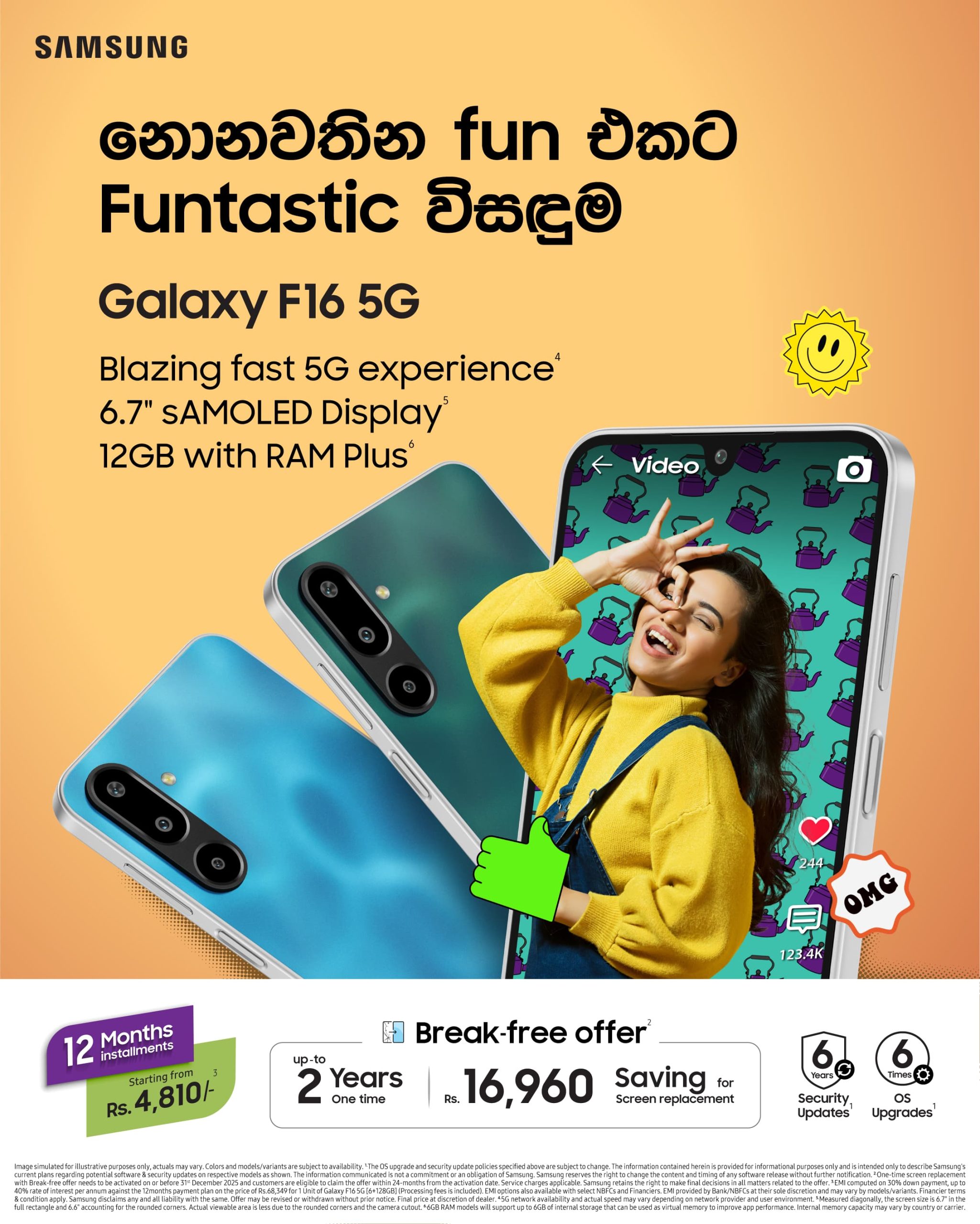 இப் புதிய அறிமுகத்தின் கீழ், ஸ்மார்ட் கையடக்கத் தொலைபேசி திரைகளை இரண்டு ஆண்டுகளுக்கு ஒரு முறை மாற்றும் Break Free Offer உள்ளிட்ட பல சலுகைகளை வழங்க Samsung நடவடிக்கை எடுத்துள்ளது. இதன் மூலம் 16,960 ரூபா வரை சேமிக்கலாம். மேலும், EMI சலுகையின் மூலம், Galaxy F16 5G சாதனத்தை 20,505 ரூபா முன்பணம் செலுத்தி, 12 மாதங்களுக்கு மாதம் 5,056 ரூபா மட்டுமே செலுத்தி வாங்க முடியும். இதனால் வாடிக்கையாளர்களுக்கு Galaxy F16 5G ஸ்மார்ட் கையடக்கத் தொலைபேசியொன்றை சொந்தமாக்கிக் கொள்ளும் வாய்ப்பைப் பெறலாம்.